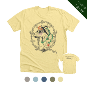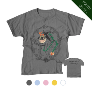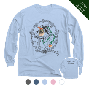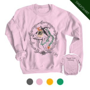 This gorgeous design highlighting Toby’s gentle yet fierce spirit was drawn by Laura Tomann, a talented supporter of PFS. This little boy’s sweet personality & demeanor captures the heart of everyone who meets him, especially after learning about the cruelty & neglect he experienced at the hands of humans. Show off your Toby love & support of the Sanctuary! Your contribution will immediately be put to use: the proceeds from each t-shirt or hoodie sold goes directly to the care & support of Toby and all of the other animals that call PFS home.