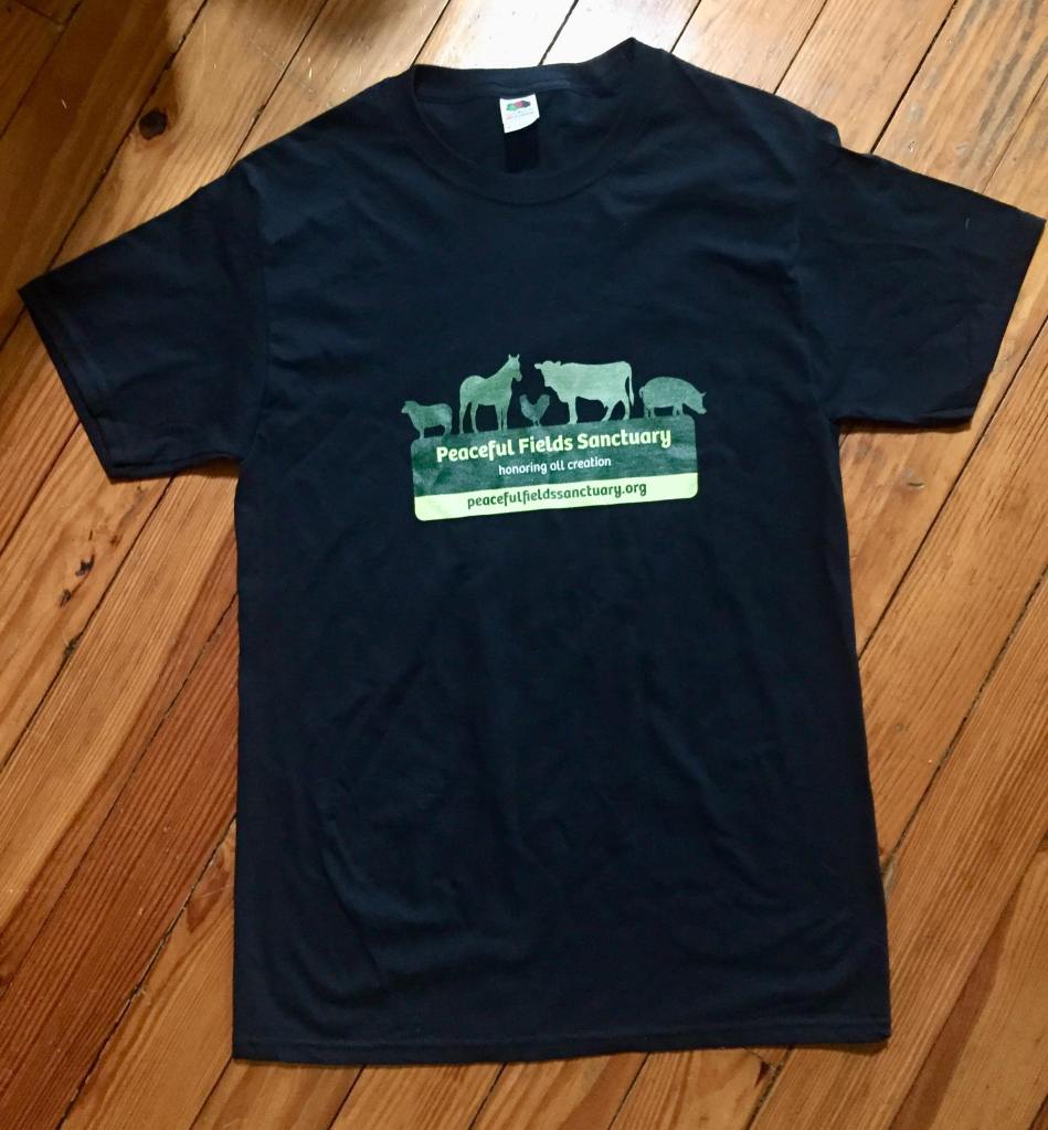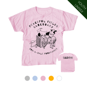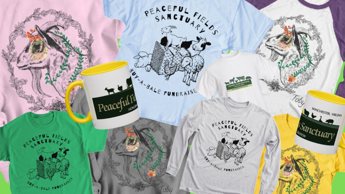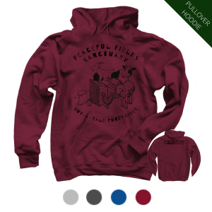 This design was drawn by Autumn Rain, a talented supporter of PFS, to benefit our ongoing Hay & Straw Fundraiser. Straw and hay are a daily staple here at the Sanctuary, with straw providing warm, clean beds for each of our rescued residents & hay providing the bulk of nutrition for our animals’ breakfast and dinner, especially during the winter. We spend around $6,000 on hay & straw alone during the winter season. Your contribution will immediately be put to use: every t-shirt or hoodie sold donates 1 bale of straw or hay to the Sanctuary!