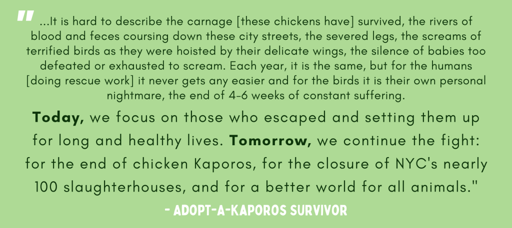 Special thanks to Adopt-A-Kaporos Survivor and Alliance to End Chickens as Kaporos, our partners in this fight to end chickens as Kaporos.