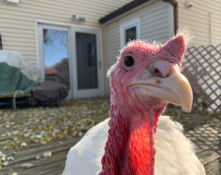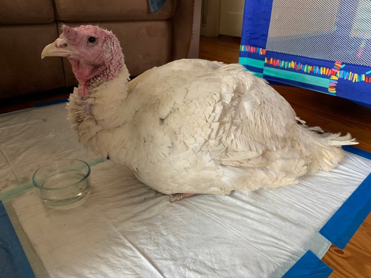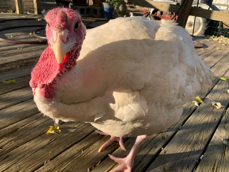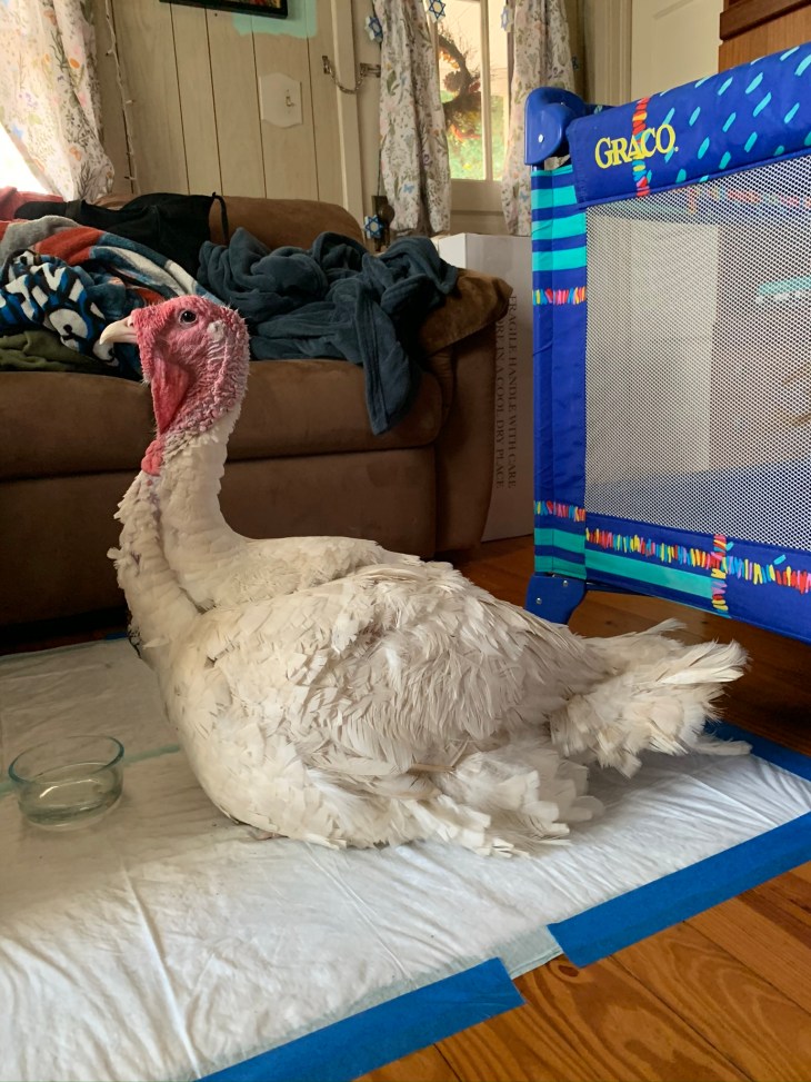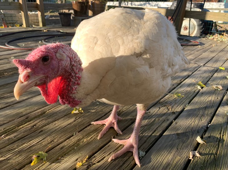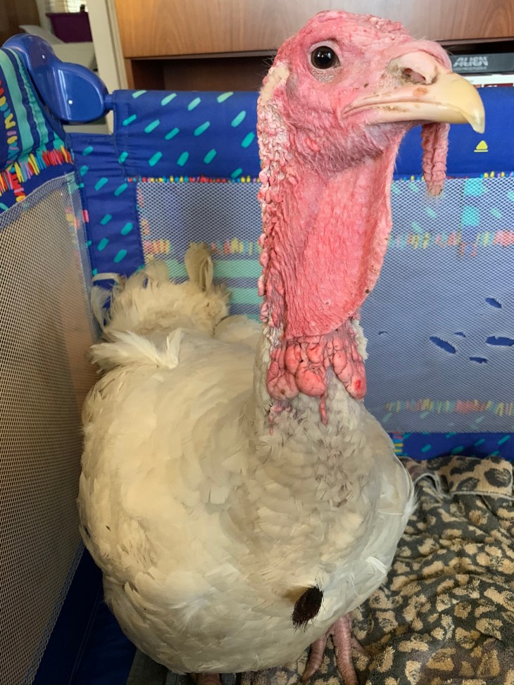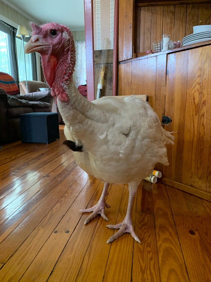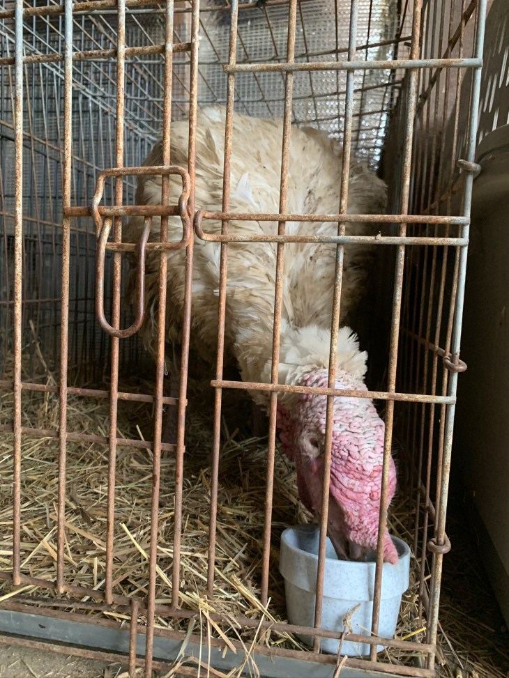 Bruce, the white double-breasted turkey, arrived at Peaceful Fields Sanctuary only weeks before he was to be slaughtered for Thanksgiving 2020 at Fredericksburg, Virginia farm.