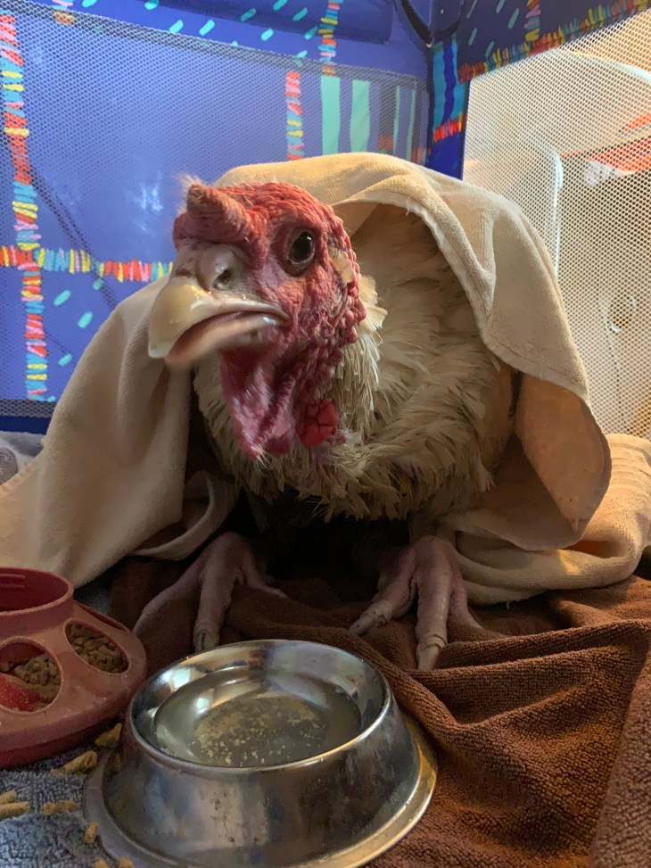 Over the course of the next two weeks, he spent days sunbathing on the fenced-in deck and nights indoors in a repurposed PackNPlay until he was strong enough to walk on his own and join the rest of the flock.
